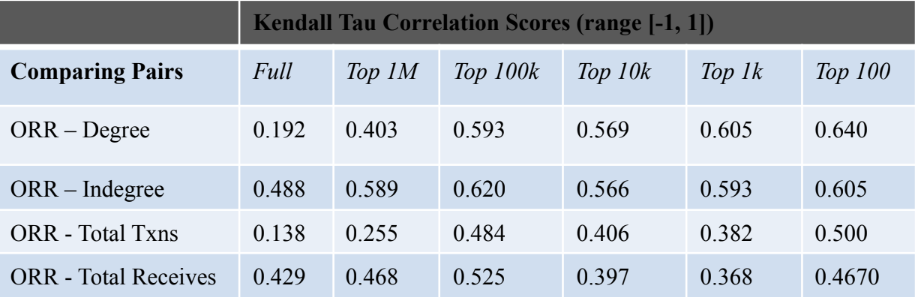 * Correlation with “Total Receives” is pretty good because it matches with ORR Intuition (b). Alice receiving transactions from Bod means that Alice is important to Bob. However, “Total Receives” still count replicated oriented connections. Correlation with “Indegree” is highest because it matches ORR Intuition (b, d) and presents exact relations among accounts (i.e. matching Intuition (a) at highest level).&#x20;