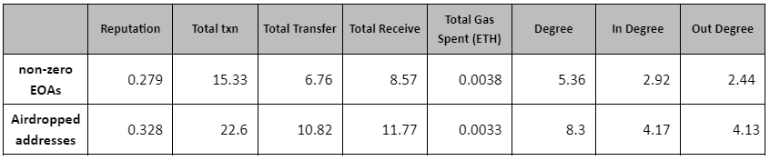 <figure><img src="https://2267206078-files.gitbook.io/~/files/v0/b/gitbook-x-prod.appspot.com/o/spaces%2FrMyzTepBcW19VWiSl6eo%2Fuploads%2FdP3HwS5Y2xA2FgXmZ92A%2F8.PNG?alt=media&#x26;token=1753e397-d864-4ce8-8ef4-c24da27db2ef" alt=""><figcaption><p><strong>The average RS, txns, degree, indegree, outdegree of airdropped addresses is higher than those of non-zero EOAs on Arbitrum Ecosystem.</strong></p></figcaption></figure>