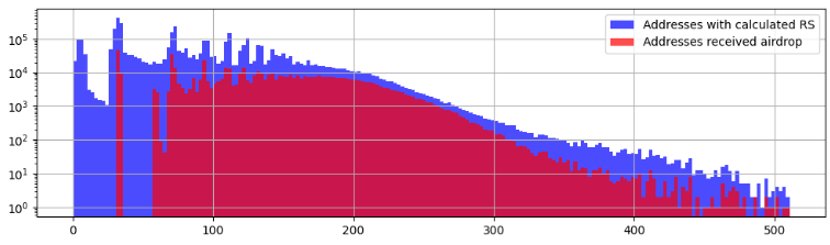 <figure><img src="https://2267206078-files.gitbook.io/~/files/v0/b/gitbook-x-prod.appspot.com/o/spaces%2FrMyzTepBcW19VWiSl6eo%2Fuploads%2FxSida1zR36JUSG5CpJxa%2F55.PNG?alt=media&#x26;token=cfcc235f-24eb-440f-9768-c61f0967da96" alt=""><figcaption><p><strong>RS Distribution of 3,801,484 RS calculated non-zero EOAs on Arbitrum (excluding the partition ‘Highest’ score) and 558,339 airdrop receivers (14.69% of the aforementioned EOA group, 99.98% of total airdrops)</strong></p></figcaption></figure>